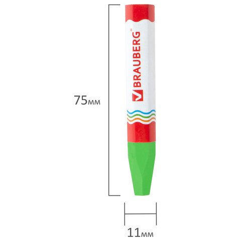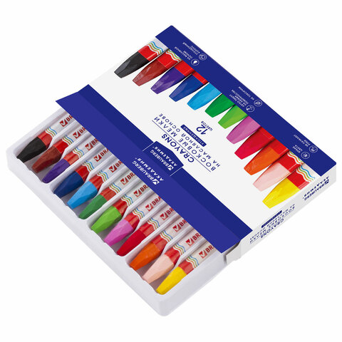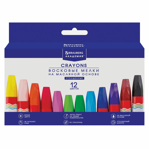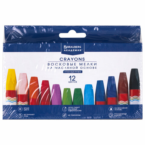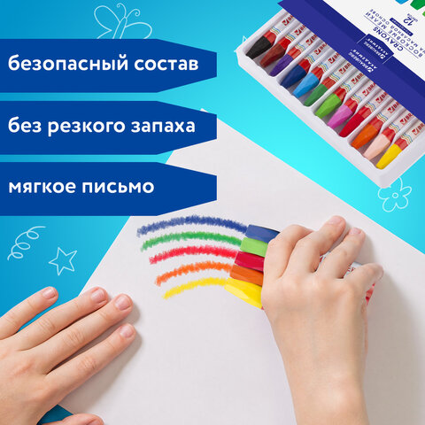 Палитра состоит из 12 ярких и насыщенных цветов. Полностью безопасны в использовании, не токсичны и не имеют резкого запаха. Благодаря своему составу карандаши пишут мягко, и ребенку не придется прикладывать усилия в процессе рисования. Утолщенная шестигранная форма корпуса и диаметр 11 мм делают их еще более удобными для тренировки руки к письму у дошкольников и детей младшего школьного возраста, формируют навык правильного захвата, снижают нагрузку на кисти рук, отлично развивают мелкую моторику. Каждый мелок завернут в бумажную гильзу, которая позволяет не пачкать руки, снижает скольжение, увеличивает прочность мелка. Восковые карандаши упакованы в картонную коробку с европодвесом.