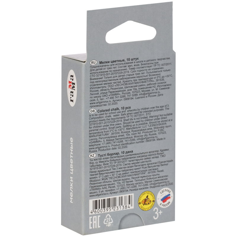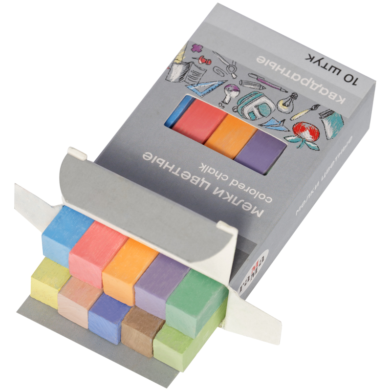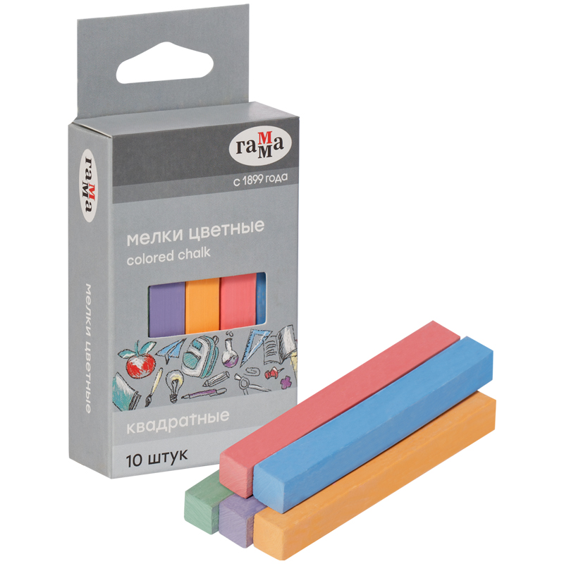 Набор из 10 квадратных цветных школьных мелков ГАММА подходит для письма или рисования на школьной доске или любой шероховатой поверхности. Длина мелка – 8 см. В упаковке 10 штук в 10-ти цветах: красный, голубой, зелёный, жёлтый, фиолетовый, оранжевый, коричневый, салатовый, синий, светло-коричневый. <br/>Удобная форма и мягкое письмо. Мягкие мелки состоят на 95% из натурального мела и не содержат гипс. Мел удобно лежит в руке, не царапает рабочую поверхность и не пылит при письме. Не имеют выраженного запаха. Экономично расходуется - одного набора хватает надолго. Следы мелков легко очищаются с рук. Набор упакован в картонную коробку с европодвесом.<br/>НЕ РЕКОМЕНДОВАНО ДЛЯ ПИТАНИЯ!<br/>• Цвет: ассорти;<br/>• Количество цветов: 10;<br/>• Количество штук: 10;<br/>• Форма: квадратная;<br/>• Длина мелка – 8 см.