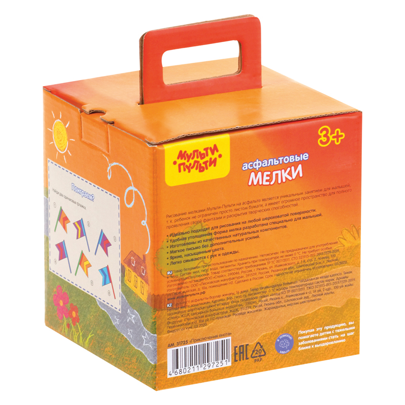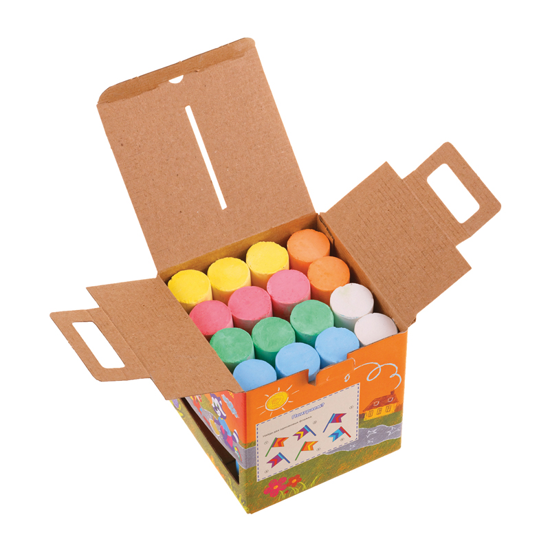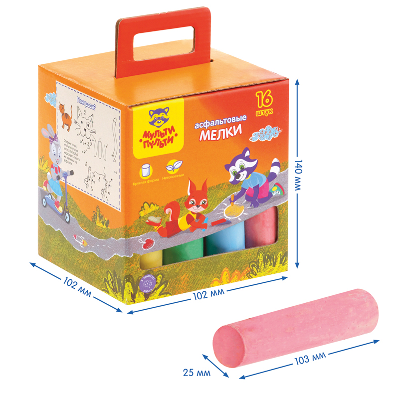 Набор из 16 круглых мелков для асфальта «Мульти-Пульти» идеально подходит для рисования на любой шероховатой поверхности. Длина мелка — 105 мм, а диаметр составляет 24 мм. В наборе 16 асфальтовых мелков в 6 цветах: 2 оранжевых, 2 белых, 3 жёлтых, 3 голубых, 3 красных и 3 зелёных. Удобная форма мела разработана специально для детей. Мел средней твёрдости подходит для детей старше 3-х лет.