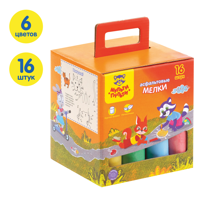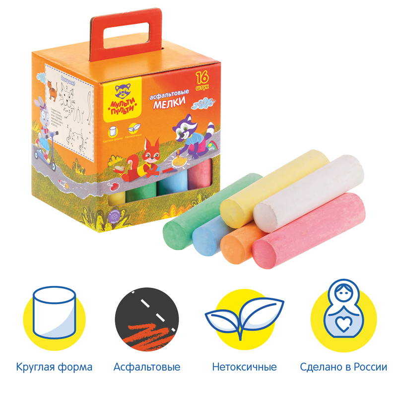Набор из 16 круглых мелков для асфальта «Мульти-Пульти» идеально подходит для рисования на любой шероховатой поверхности. Длина мелка — 105 мм, а диаметр составляет 24 мм. В наборе 16 асфальтовых мелков в 6 цветах: 2 оранжевых, 2 белых, 3 жёлтых, 3 голубых, 3 красных и 3 зелёных. Удобная форма мела разработана специально для детей. Мел средней твёрдости подходит для детей старше 3-х лет.<br/>Упакованы в яркую картонную коробку, которая обязательно понравится ребёнку. НЕ РЕКОМЕНДОВАНО ДЛЯ ПИТАНИЯ.<br/>• Количество цветов: 6;<br/>• Длина мелка: 105 мм;<br/>• Диаметр мелка: 24 мм