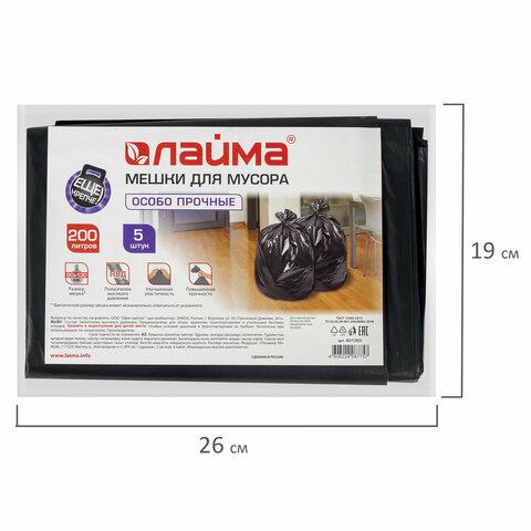 Изготовлены из полиэтилена высокого давления (ПВД) плотностью 50 микрон и имеют объем 200 литров. Размер мешка - 90х130 см (±5%). Поставляются в пачке по 5 штук. Преимуществами данных мешков для мусора являются: устойчивость к разрыву, высокая прочность, большой объем и грузоподъемность.