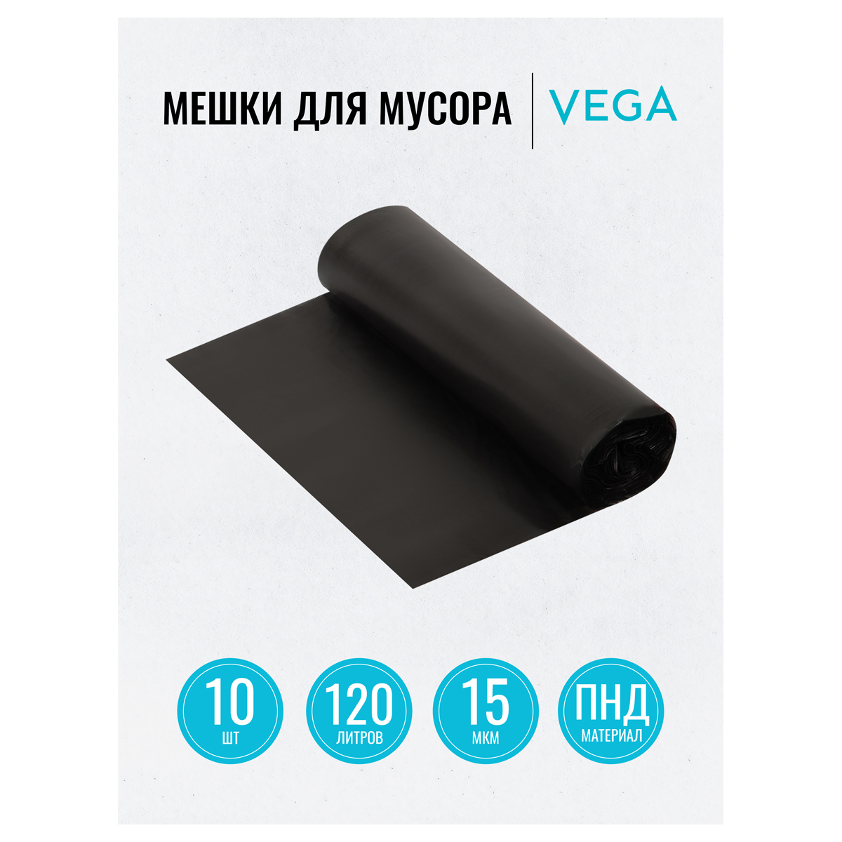 Мешки для мусора VEGA производятся из полиэтилена низкого давления (ПНД) повышенной прочности. Мешки объемом 120 литров размера 70*110 см плотностью 15 мкм используются для хозяйственных, промышленных нужд. В рулоне 10 штук. <br/>ПНД – тонкий, шуршащий материал химически нейтральный, не вступает в реакцию с жирами и кислотами и не подвержен гниению. <br/>• объем мешков: 120 л.;<br/>• плотность: 15 мкм;<br/>• размер: 70*110 см (+-5%);<br/>• количество: 10 штук.