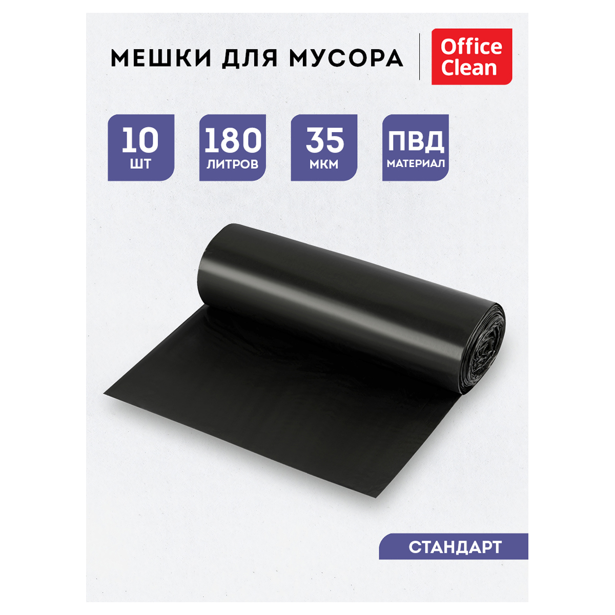 Мешки для мусора OfficeClean производятся из полиэтилена высокого давления (ПВД). Мешки объёмом 180 литров размера 90*110 см плотностью 35 мкм используются для хозяйственных, промышленных нужд. В рулоне 10 штук. <br/>ПВД – химически нейтральный материал, не шуршит, имеет красивую блестящую поверхность и не подвержен воздействию жиров и кислот. Имеет большую разрывную нагрузку, полотно плотнее, чем у полиэтилена низкого давления. <br/>• Объём мешков: 180 л;<br/>• Плотность: 35 мкм;<br/>• Размер: 90*110 см (+-5%);<br/>• Количество: 10 штук.