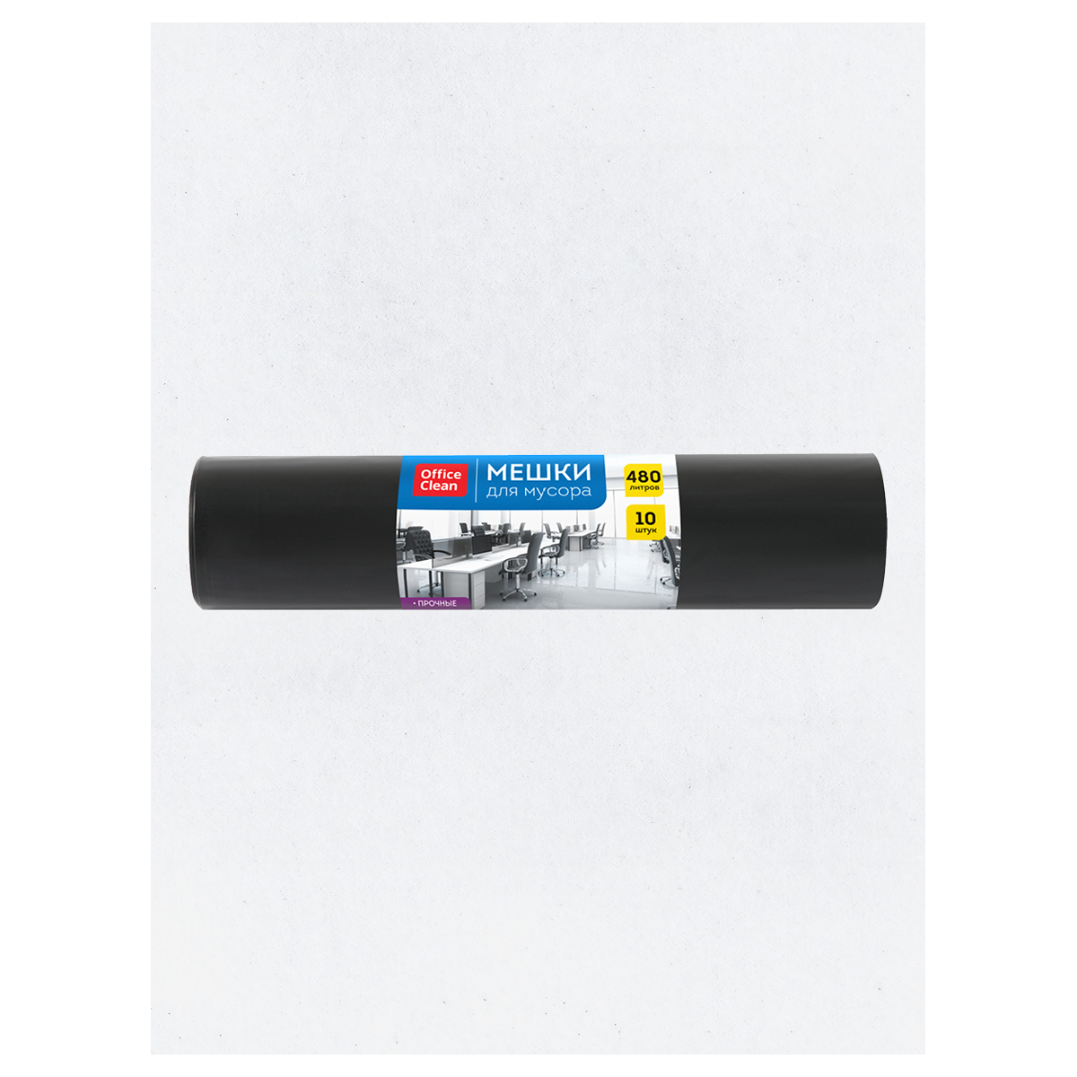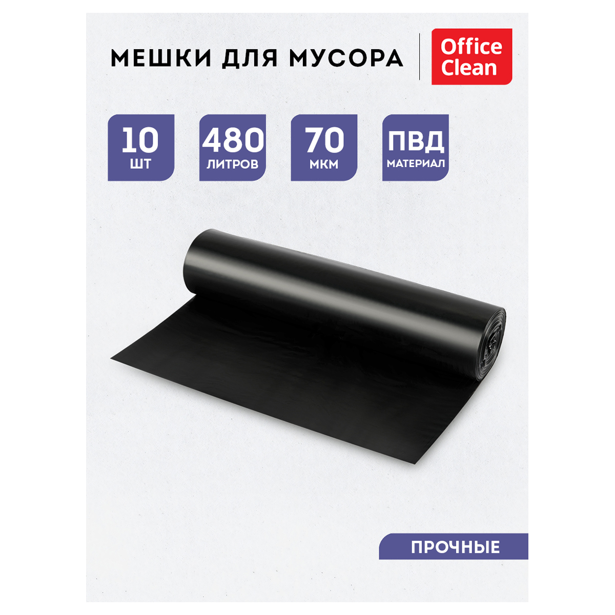 Мешки для мусора OfficeClean производятся из полиэтилена высокого давления (ПВД). Мешки объёмом 480 литров размера 130*170 см плотностью 70 мкм используются для хозяйственных, промышленных нужд. В рулоне 10 штук. <br/>ПВД – химически нейтральный материал, не шуршит, имеет красивую блестящую поверхность и не подвержен воздействию жиров и кислот. Имеет большую разрывную нагрузку, полотно плотнее, чем у полиэтилена низкого давления. <br/>• Объём мешков: 480 л;<br/>• Плотность: 70 мкм;<br/>• Размер: 130*170см (+-5%);<br/>• Количество: 10 штук.