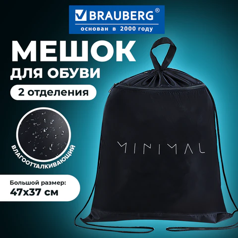 Мешок для обуви BRAUBERG – необходимый аксессуар в школе. Подходит для сменной обуви и физкультурной формы, вещей для факультативных занятий. Можно носить на плечах за спиной или в руке с помощью петельки.