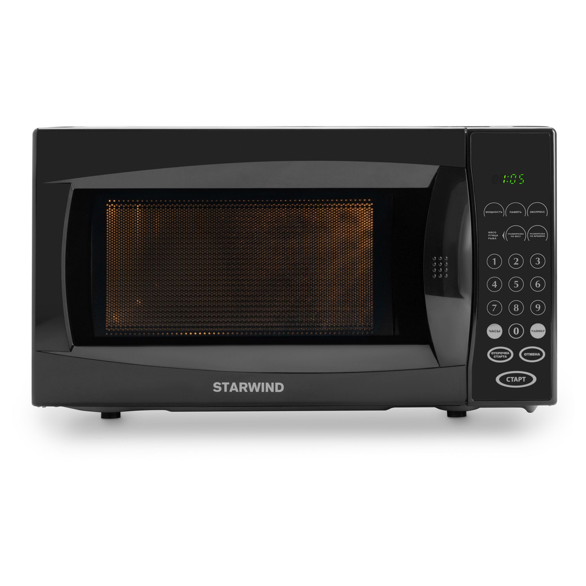 Микроволновая печь Starwind SMW5020 с камерой объемом 20 л и поворотным столом диаметром 24,5 см подойдет не только для подогрева и размораживания продуктов, но и для быстрого приготовления простых блюд. Электронная панель управления с сенсорными кнопками и цифровым дисплеем обеспечивает возможность точной настройки всех ключевых параметров. Прибор также оснащен защитой от случайного включения детьми.<br/><br/>Электронное управление. Выбор необходимого режима, функции, мощности и времени работы с точностью до секунды осуществляется при помощи сенсорных кнопок и светящегося цифрового ЖК-дисплея. В режиме ожидания последний может использоваться в качестве часов.<br/><br/>10 уровней мощности. Возможность регулирования мощности с шагом 10% позволяет подобрать оптимальный уровень для приготовления и разогрева любого блюда.<br/><br/>Экспресс-режим. Для быстрого разогрева в течение 15, 30, 60 и 120 секунд достаточно нажать кнопку «Экспресс» 1-4 и затем кнопку «Старт».<br/><br/>3-этапное приготовление. При помощи кнопки «Память» можно задать последовательное автоматическое выполнение трех заранее выбранных программ, включая режим разморозки.<br/><br/>Отсрочка старта. Данная функция позволяет запустить заранее выбранную программу с таким расчетом, чтобы процесс готовки завершился в нужное время.<br/><br/>Разморозка по времени и весу. Функционал модели позволяет подобрать наиболее подходящее время воздействия в зависимости от веса и типа продуктов для эффективного и бережного размораживания.<br/><br/>Защита от детей. Длительное нажатие на кнопку «Отмена» заблокирует все остальные, исключив случайное включение прибора детьми.<br/><br/>Микроволновая печь Starwind SMW5020 удачно сочетает в себе компактность, функциональность и стильный дизайн. Широкий выбор программ и режимов позволяет приготовить блюда даже из замороженных продуктов к назначенному времени, варьируя мощность и время воздействия микроволн на разных этапах. Наличие экспресс-режима обеспечивает возможность запуска быстрого разогрева нажатием лишь двух кнопок, а функция защитной блокировки способствует безопасности эксплуатации.