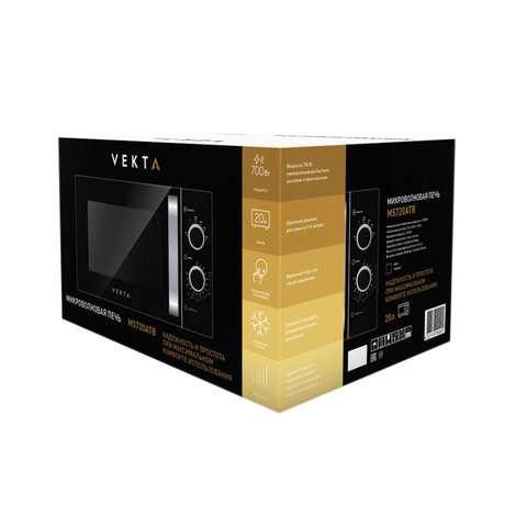Микроволновая печь VEKTA MS720ATB – сочетание функциональности и современного дизайна. Классический чёрный цвет корпуса подойдет к любому интерьеру, а привычное и понятное механическое управление не покажется сложным в обращении.