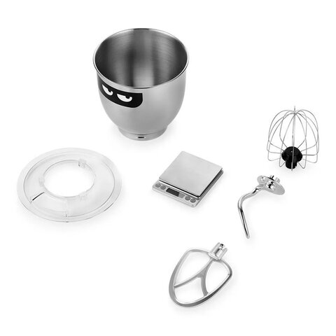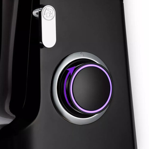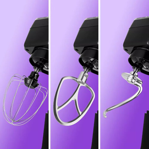 Миксер оснащен 10 скоростями и импульсным режимом, которые позволяют точно настроить процесс смешивания. Плавное увеличение скорости при включении предотвращает разбрызгивание ингредиентов, а подсветка регулятора добавляет удобства при работе. В комплекте идут три насадки: венчик для взбивания, крюк для замеса крутого теста и насадка для смешивания продуктов и приготовления пюре. Форма насадок и чаши обеспечивает качественное и быстрое перемешивание даже при небольшом количестве ингредиентов.