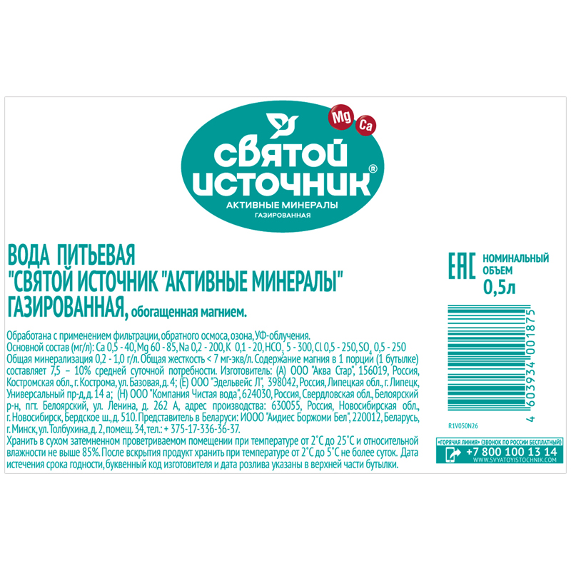 «Святой Источник «Активные минералы» - питьевая газированная вода, обогащенная комплексом минералов на основе магния, который помогает защищать организм от стресса. Источник магния на каждый день – не менее 7,5% от суточной нормы магния в 0,5 л.