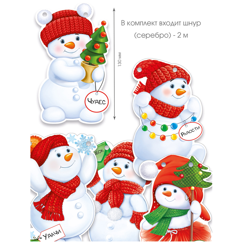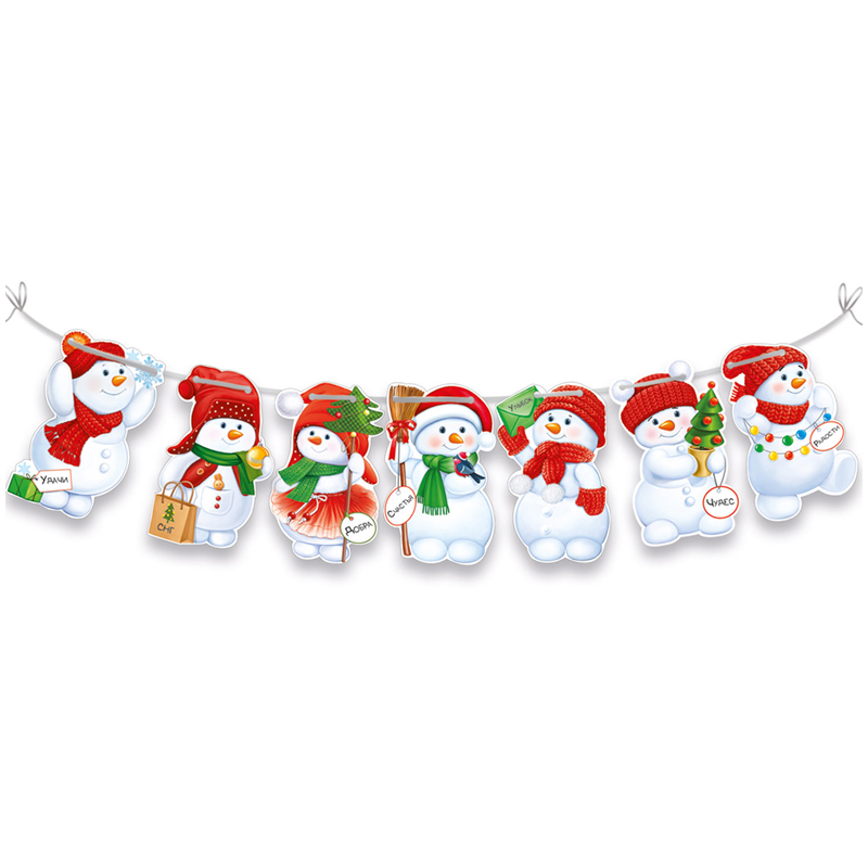 Мини-гирлянда с очаровательными персонажами и новогодними пожеланиями – она точно понравится детям и взрослым! Ее можно использовать, как милое дополнение к новогоднему интерьеру в комнате, школе или детском саду. <br/><br/>Размер каждого элемента вы можете увидеть на картинке. Шнур также входит в комплект. Материал – картон.