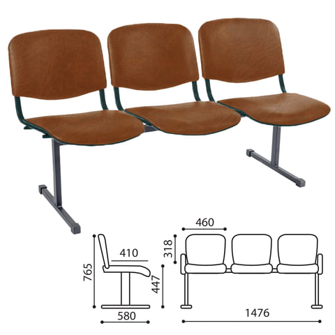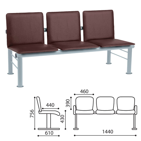 Кресло для посетителей трехсекционное "Трим", черный каркас, кожзам коричневый