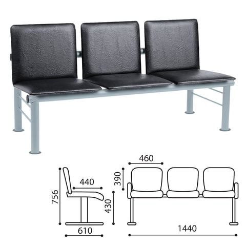 Кресло для посетителей трехсекционное "Тройка", 840х1420х510 мм, черный каркас, черный кожзам, СМ 91-03 К01