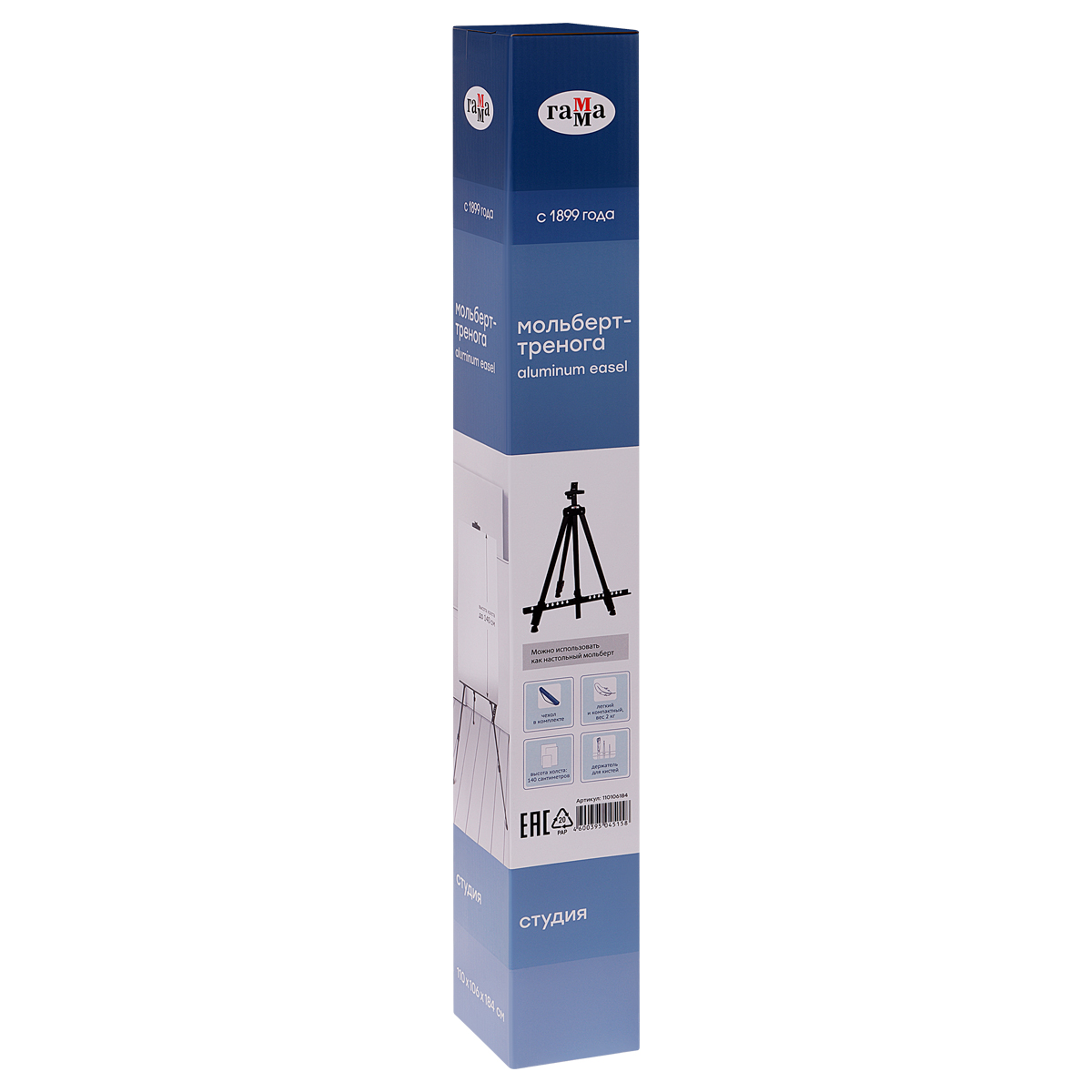 Переносной алюминиевый мольберт ГАММА «Студия» – идеальная модель для пленэра, путешествия, но может быть использован как настольный мольберт. Это самый высокий алюминиевый мольберт "ГАММА", максимальная высота 184 см. Мольберт при этом легкий и компактный, весит 2 кг. Размер мольберта – 110*106*184 см, максимальный размер холста для работы – 140 см. <br/> Мольберт оснащён полкой для установки холста и держателем для кистей. Телескопические ножки легко раскладываются и надёжно фиксируются, пластиковые опоры обеспечивают устойчивость даже на неровной поверхности. За мольбертом удобно работать и сидя, и стоя. Изготовлен из алюминия. Удобно хранить в сложенном виде. Чехол для бережного хранения и удобной транспортировки — в комплекте.<br/>• Вид мольберта: напольный/настольный;<br/>• Тип: трансформер;<br/>• Складная конструкция;<br/>• Высота мольберта: 184 см;<br/>• Материал: алюминий;<br/>• Максимальный размер холста: 140 см.