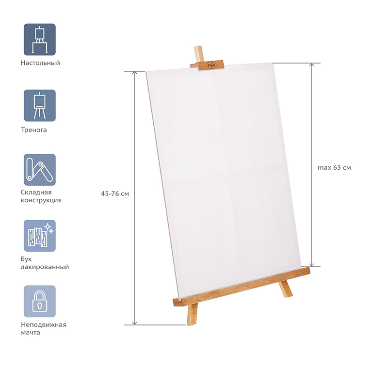 Настольный мольберт-тренога ГАММА «Студия» – классическая модель для небольших форматов, которая подойдёт для обучения живописи и демонстрации работ. Размер мольберта – 40*32*45(76) см, максимальный размер холста для работы – 68 см.
