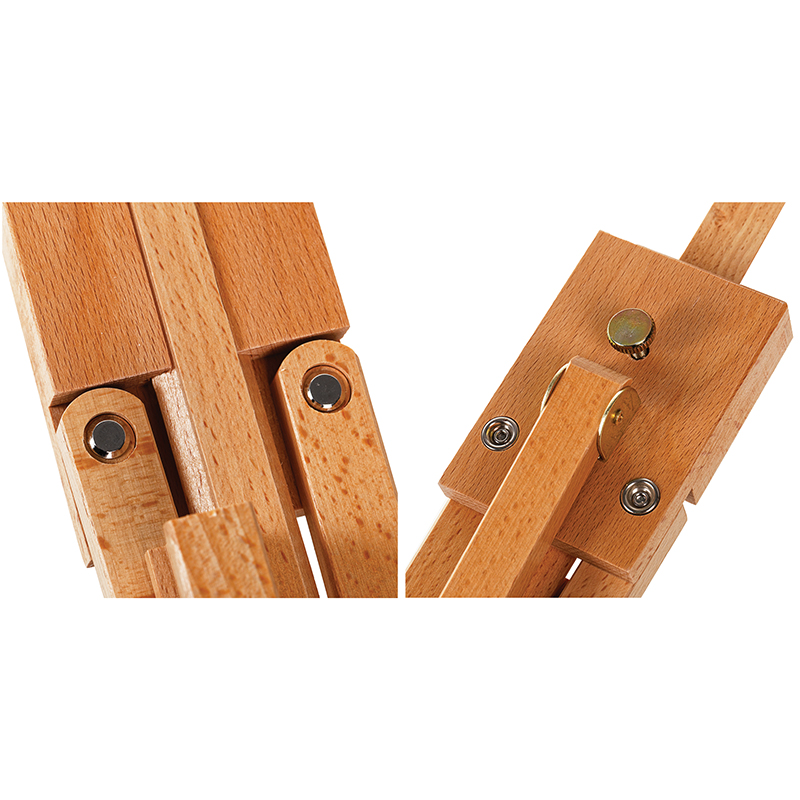 Устанавливается на стол или другую рабочую поверхность имееет плавную регулировку высоты. Изготовлен из лакированного бука. Мольберт удобно хранить в сложенном виде.
