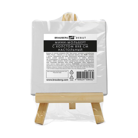 Размер мольберта - 12х7,5 см. Размер холста - 8х8 см. Набор упакован в термоусадку.