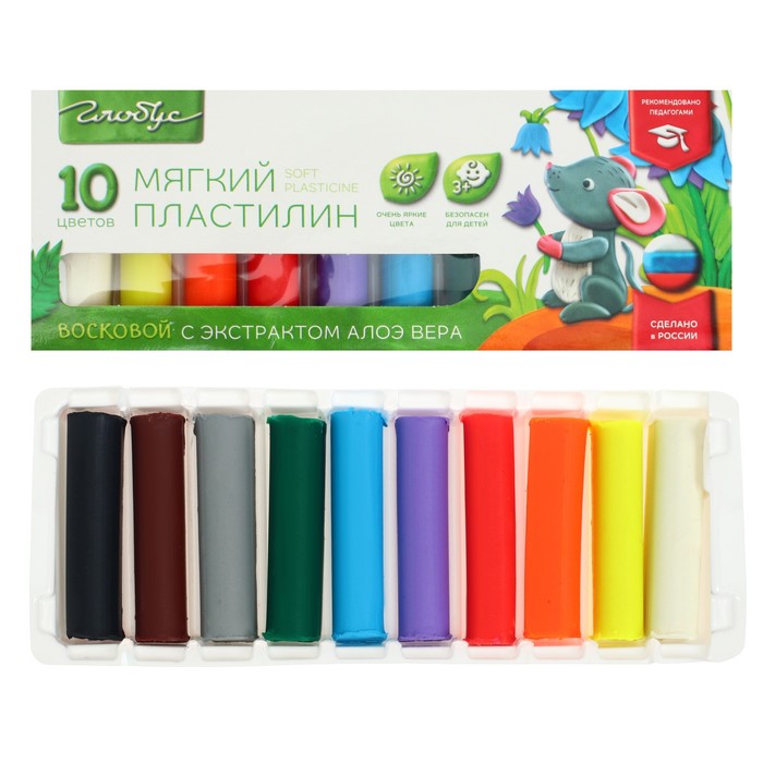 Пластилин мягкий (восковой), 10 цветов, 150 г, GLOBUS, с Алоэ Вера, со стеком