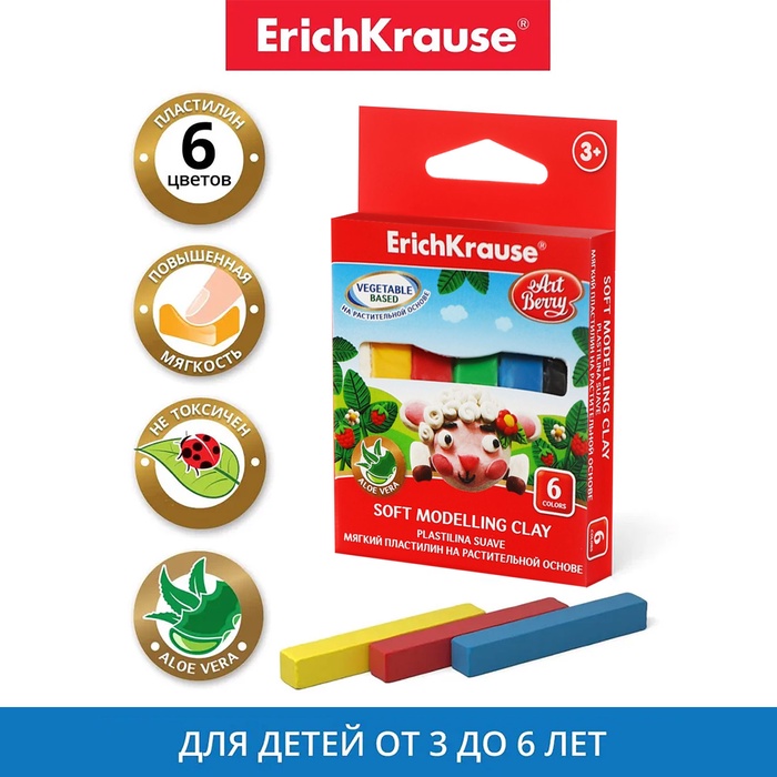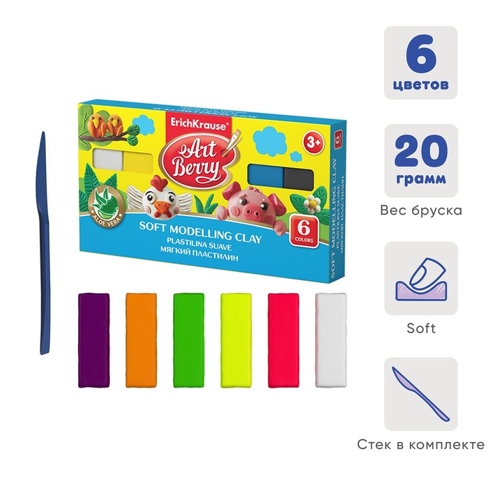Пластилин мягкий (восковой), 6 цветов, 120 г, ErichKrause ArtBerry премиум, с Алоэ Вера, со стеком, картон, с европодвесом