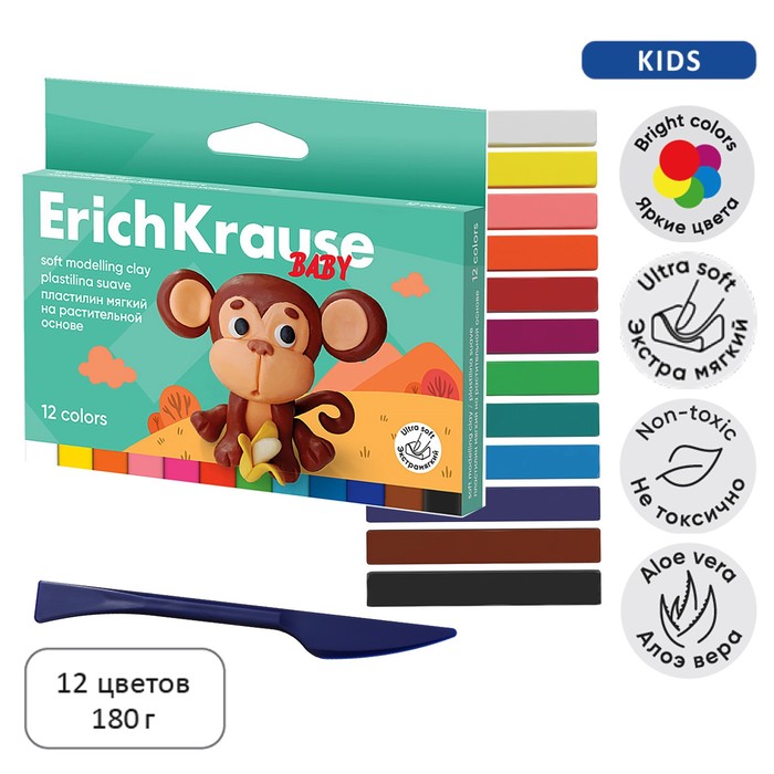 Пластилин мягкий 12 цветов, 180 г, ErichKrause "Baby", на растительно основе, с Алоэ Вера , европодвес