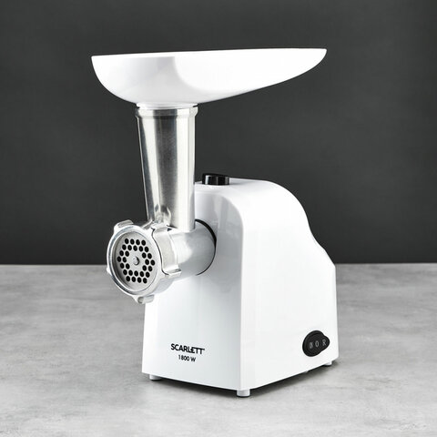 Мясорубка SCARLETT SC-MG45M20 с производительностью 2 кг/мин подходит для измельчения сырых и обработанных продуктов, натирания и шинковки, а также приготовления колбас и кеббе.