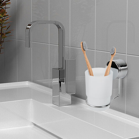 Стакан для туалетных принадлежностей LAIMA с держателем для крепления на стену. Можно расположить вблизи раковины или в душевой в удобном месте.