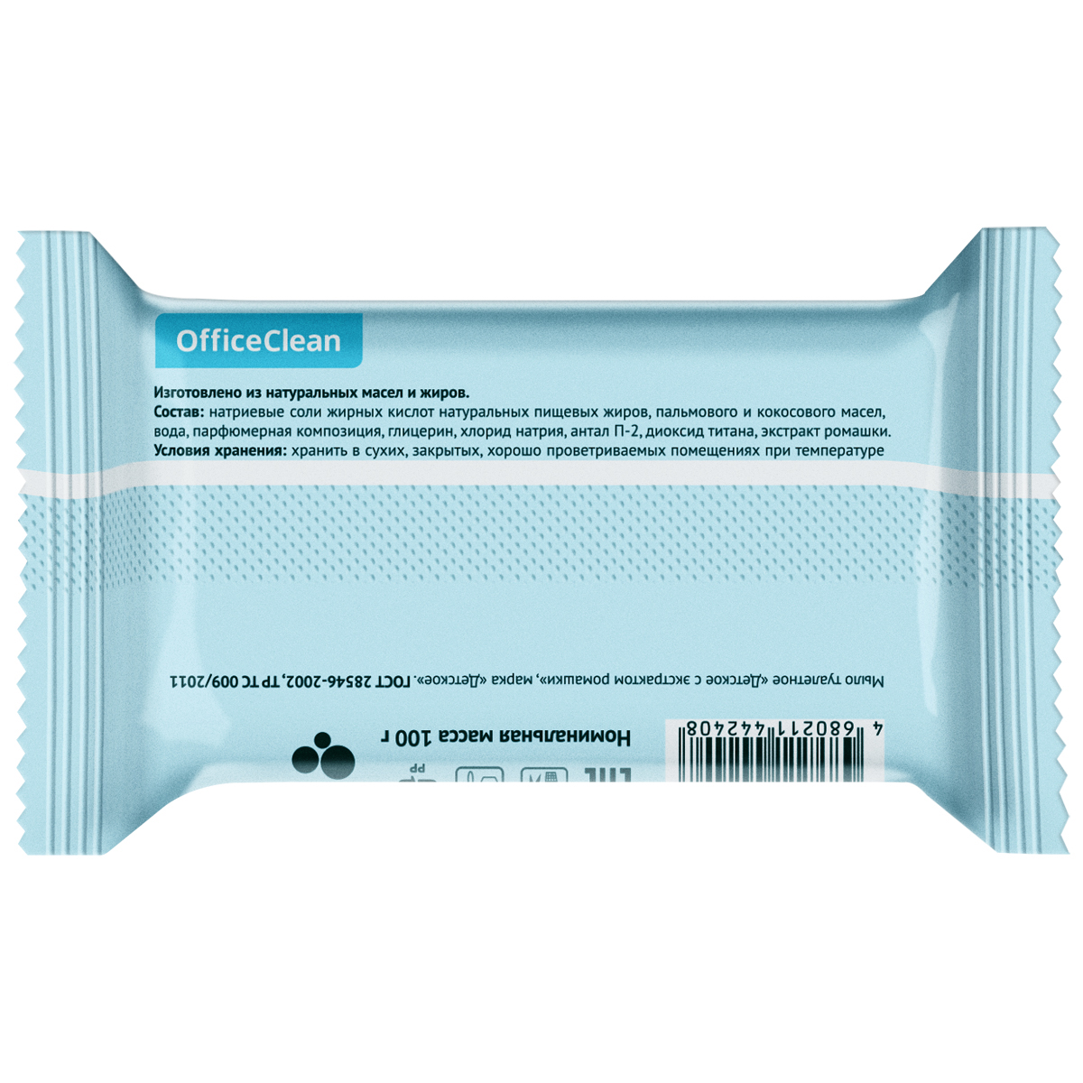 Туалетное мыло OfficeClean «Детское с ромашкой» производится из натуральных компонентов, подходит для использования детьми и взрослыми с чувствительной кожей. Глицерин, входящий в состав, предотвращает потерю естественной влаги и эффективно увлажняет кожу, экстракт ромашки смягчает, снимает воспаления и раздражения, а также снижает вероятность проявления аллергических реакций. Продукт не содержит красителей, не сушит и не раздражает кожу.<br/>Кусковое мыло создаёт обильную душистую пену, оставляя ощущение свежести, чистоты и комфорта. <br/>• Вес куска: 100 граммов;<br/>• Упаковка: флоу-пак.