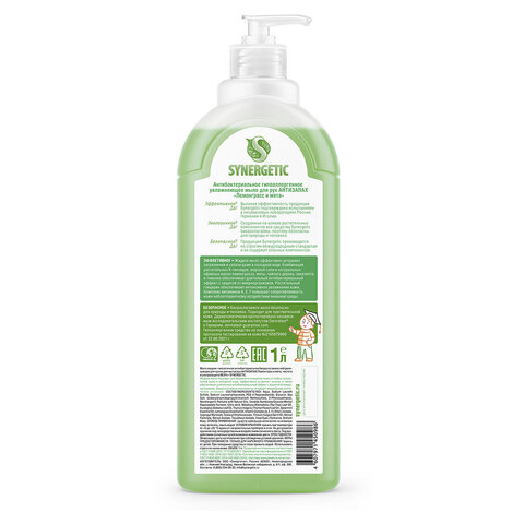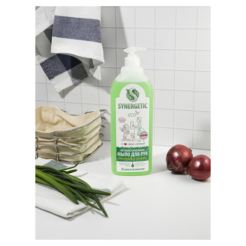 Жидкое мыло SYNERGETIC "Лемонграсс и мята". Подходит для бережного очищения кожи рук. Идеально для использования на кухне. Эффективно устраняет загрязнения и нейтрализует неприятные запахи даже в холодной воде. Предназначено для использования на кухне.