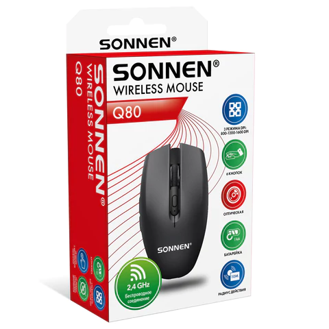 Мышь беспроводная USB, 800/1200/1600 dpi, 5 кнопок + колесо-кнопка, оптическая, SONNEN Q80, черная, 513945