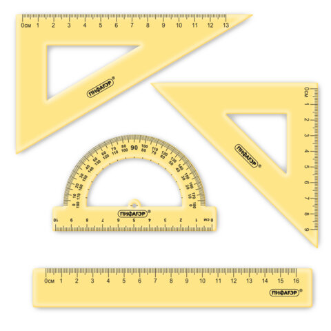Набор чертежный ПИФАГОР (линейка 16 см, 2 треугольника, транспортир), неоновый, прозрачный, ассорти, 210851