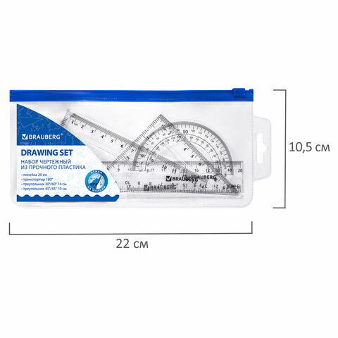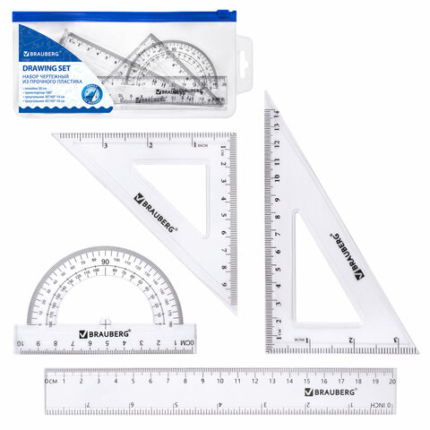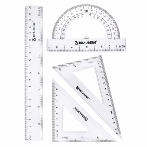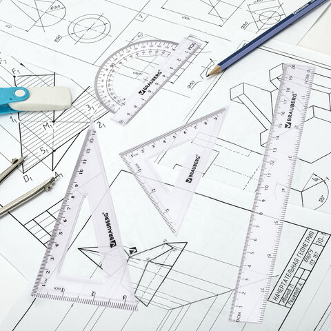 Набор чертежный BRAUBERG (линейка 15 см, треугольник, транспортир), фиолетовый, прозрачный, пенал, 210888