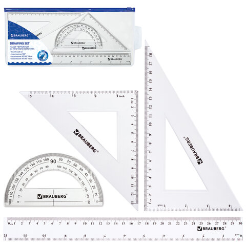 Набор чертежный большой BRAUBERG "Crystal" (линейка 30 см, 2 угольника, транспортир), выделенная шкала, 210297