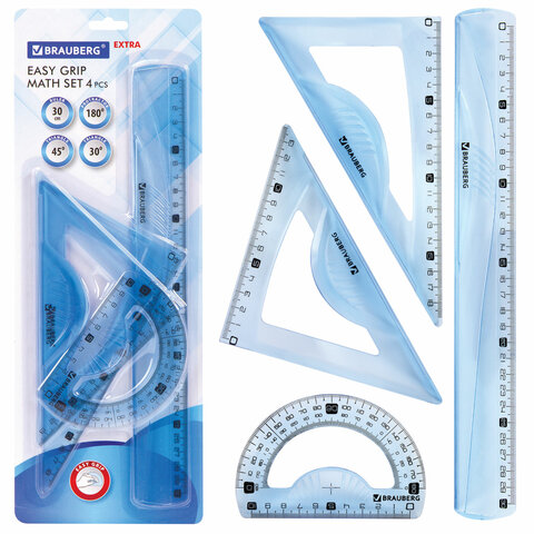 Набор чертежный BRAUBERG "EXTRA" (линейка 30 см, 2 угольника, транспортир), тонированный голубой, 210747