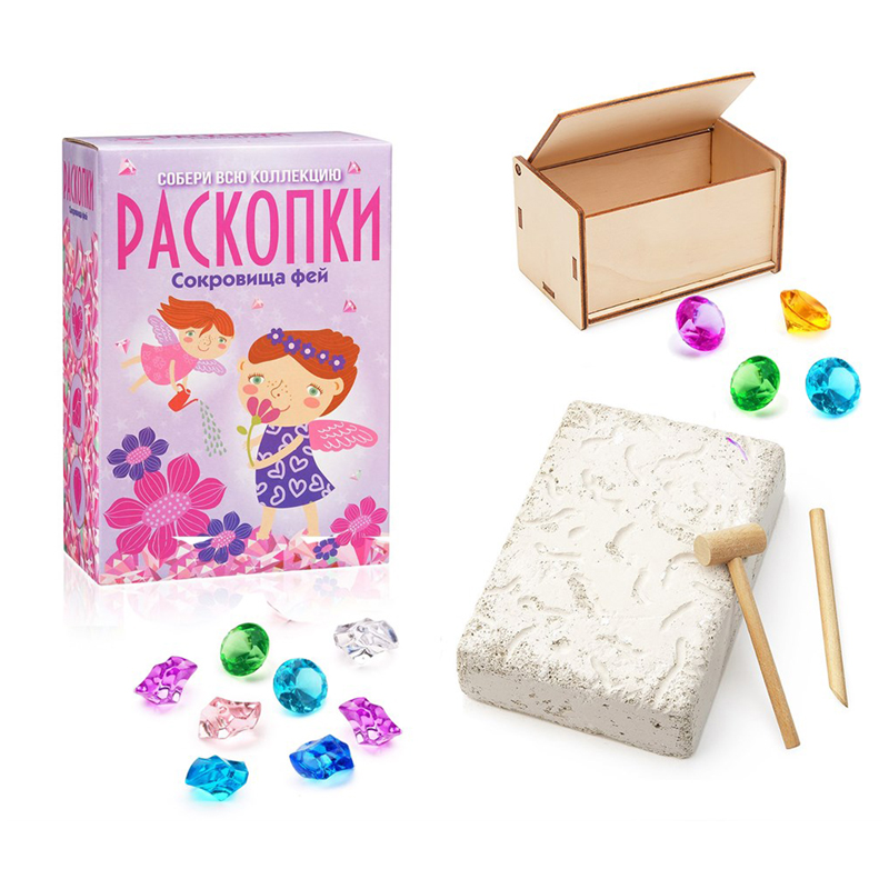 Когда-то очень давно феи спрятали свои волшебные сокровища под землей и совершенно забыли о них. А сегодня увлеченному археологу с помощью специальных инструментов из набора предстоит их отыскать. Для того чтобы искать было проще, рекомендуем смочить брусок водой. А чтобы сокровища больше никто и никогда не потерял, мы подготовили для вас сундучок. Воспользуйтесь подсказкой, соберите и украсьте прекрасный маленький сундучок. Сокровища фей теперь ваши!<br/>В наборе: деревянный молоточек, деревянный стек для дробления, окаменелый грунт, артефакты (россыпь разноцветных находок из пластика), деревянный сундучок. Цвета находок в ассортименте.