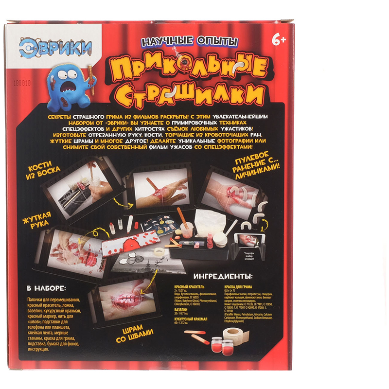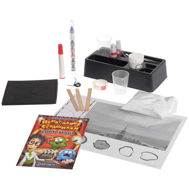 Если ваш будущий учёный любит ужастики, то его восторг от этого набора гарантирован: «Прикольные страшилки» раскрывают секреты жуткого грима из фильмов! Маленький гений как следует напугает и повеселит друзей, а заодно узнает о гримировочных техниках и других хитростях киносъёмок.