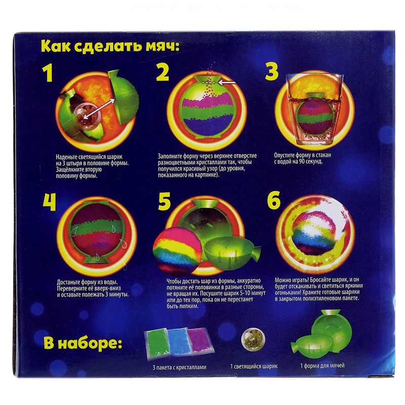 В набор входит форма для мячей-1 штукка, светящийся шарик-1 шт, пакетики с кристалами 3 шт(разных цветов).