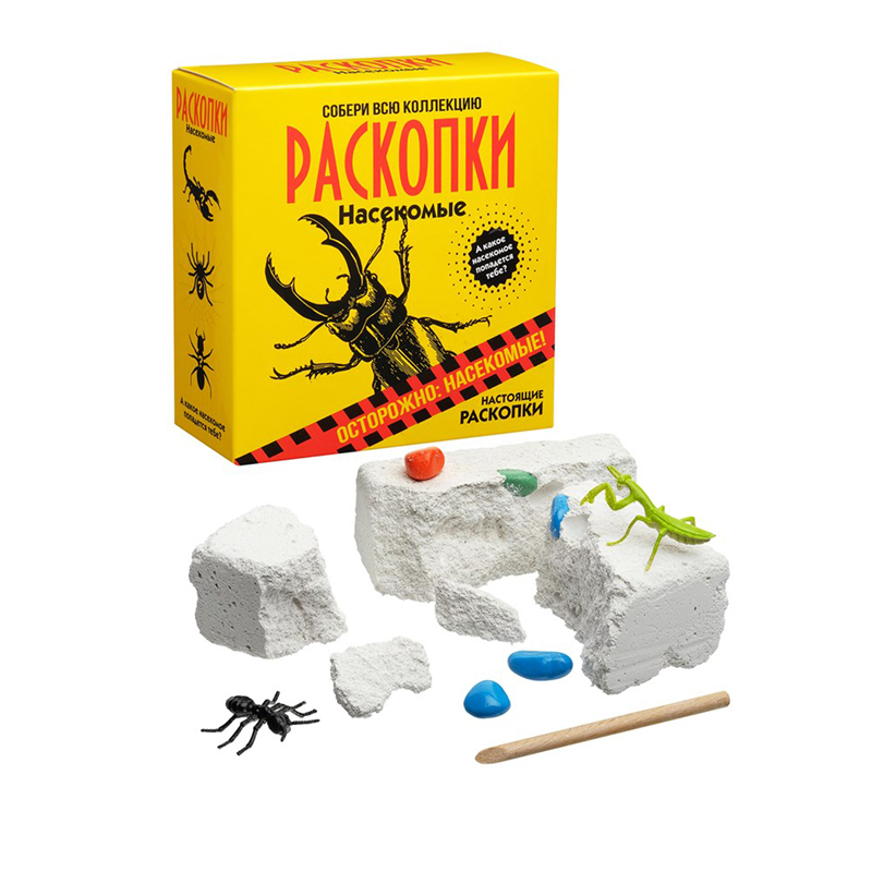 В наборе: деревянный стек для дробления, окаменелый грунт с сокровищами (россыпь разноцветных камней и фигурки насекомых из пластика). Цвета находок в ассортименте.
