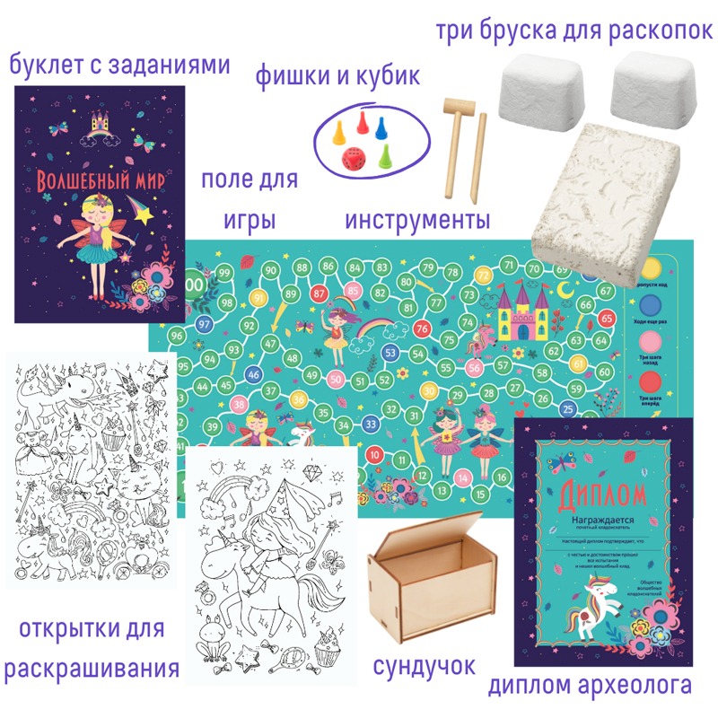 Мечтаете побывать в стране Фей? В этом квесте вам предстоит туда отправиться! А ещё спасти бабочек, заточенных в камень, разгадать загадку единорогов и познакомиться еще с парой волшебных существ, которые поделятся секретом о спрятанных сокровищах. В наборе вы найдете три бруска для раскопок с настоящими волшебными находками, а также настольную игру, книжку с квестом и три открытки для раскрашивания с единорогами и феями. <br/><br/>Набор разработан в формате квеста. За каждое выполненное задание ребенок получает букву. В конце из этих букв получится секретный ингредиент эликсира фей, который вернёт путешественника домой. Кстати, элексир фей очень вкусный, обязательно попробуйте! Все найденные в путешествии сокровища можно сложить в специальный сундучок, который есть в комплекте. Вместе с феями раскрасьте его в яркие цвета! В конце ребенок получит почетный диплом настоящего кладоискателя, а потом нарисует полюбившегося персонажа. <br/>В наборе: буклет с заданиями, настольная игра, кубик, фишки, три бруска для раскопок, инструменты для раскопок, сундучок для сокровищ, диплом кладоискателя. Цвета находок в ассортименте.