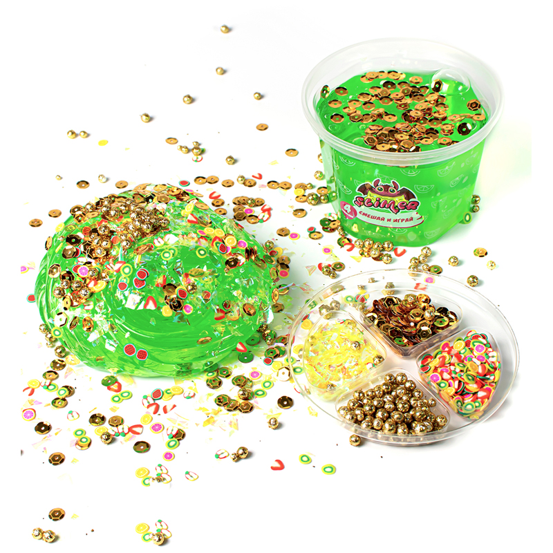 Все очень любят экспериментировать и добавлять в свои слаймы наполнители. Это стимулирует воображение и мелкую моторику, займёт ребенка на долгое время. В набор Slimer Смешай и играй входят: зеленый полупрозрачный слайм, пенопластовые шарики, блестки, голографические фигурки, посыпка.