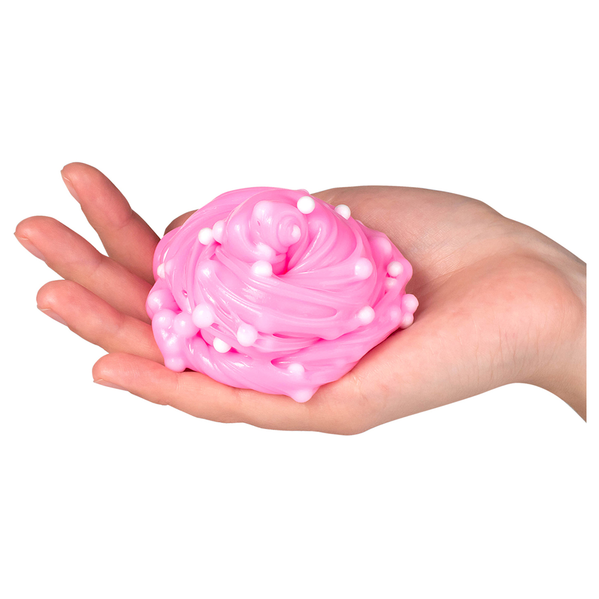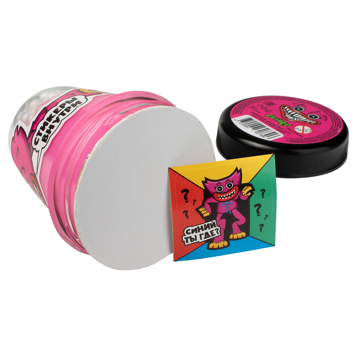 Ужаааассно классный слайм. В линейке два вида: розовый и синий слайм с шариками с мордочками монстриков на упаковке. Внутри под крышкой ты найдешь наклейку с героем, собери всю коллекцию!