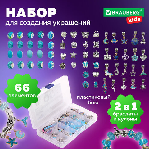 Набор для создания бижутерии и украшений 66 элементов Аквамарин, бусины, браслеты, подвески, BRAUBERG KIDS, 665291