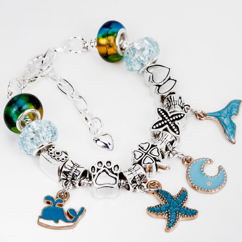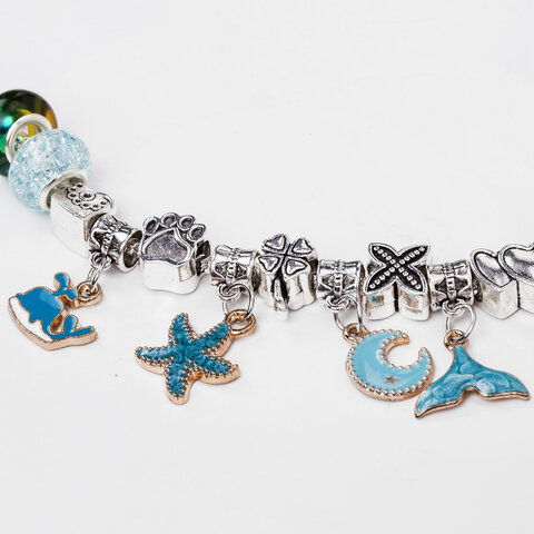 Яркие цвета бусин сочетаются между собой, а металлические шармы добавляют изюминку.