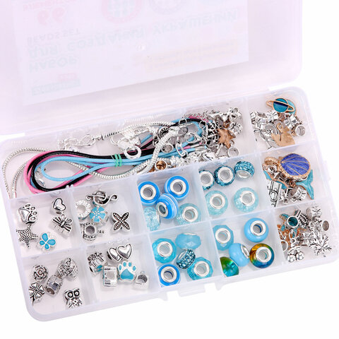 В набор "Аквамарин" входят 66 элементов: 20 пластиковых бусин различных цветов, 20 металлических шармов разных размеров, 20 металлических подвесок, 3 металлические заготовки для изготовления браслетов, 3 основы для ожерелий.