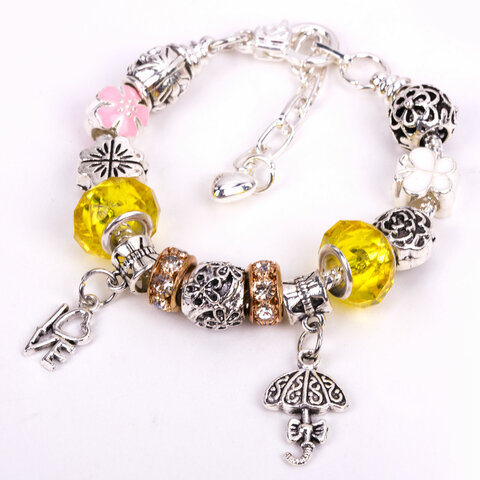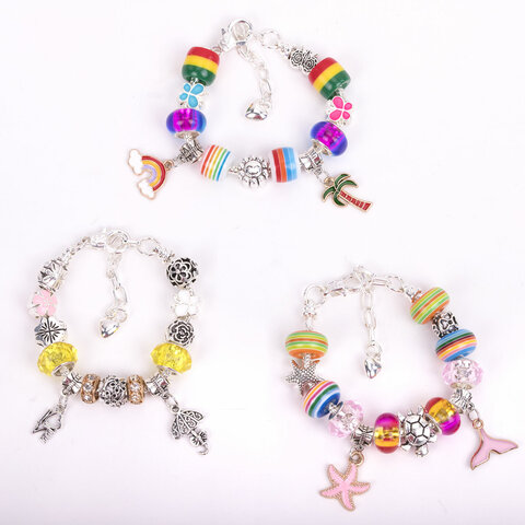 Яркие цвета бусин сочетаются между собой, а металлические шармы добавляют изюминку.