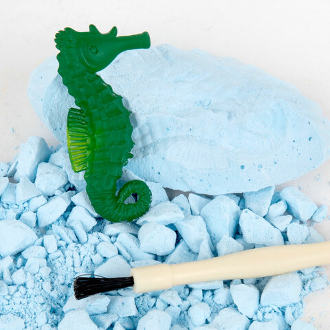В набор входят 12 гипсовых блоков в форме ракушки с морскими животными внутри, 12 инструментов для проведения раскопок (долото с кисточкой), 12 красочных двусторонних карточек с информацией о каждом животном из набора.