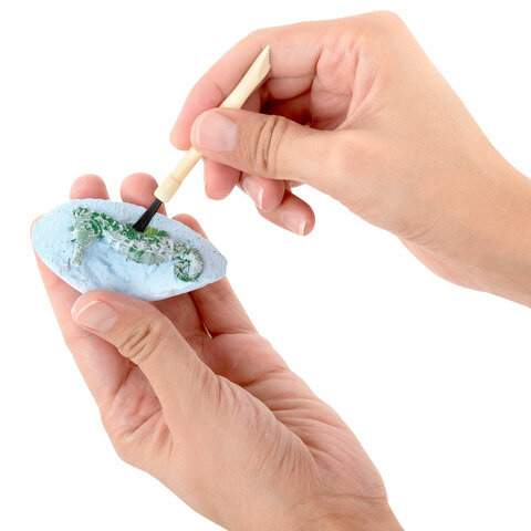 Возьмите ракушку и удобно расположите для работы на поверхности. Возьмите долото и начинайте процесс раскопок. Когда появится какая-то часть морского животного лишний гипс можно смахнуть кисточкой. После полного освобождения игрушки нужно по картинке на карточке сопоставить какое именно это животное и прочитать информацию о нем на обратной стороне карточки. Таким образом ваш ребенок будет не только увлечен процессом раскопок, но и процессом изучения информации о каждом морском животном из набора. Чтобы легче извлечь игрушку из ракушки, его можно поместить в воду на 15-20 минут для размягчения гипса.
