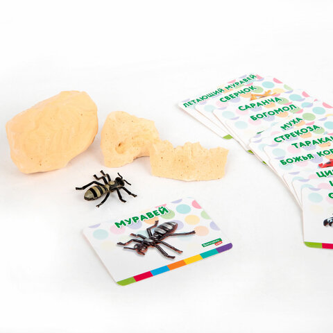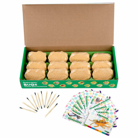 В набор входят 12 гипсовых блоков с насекомыми внутри, 12 инструментов для проведения раскопок (долото с кисточкой), 12 красочных двусторонних карточек с информацией о каждом насекомом из набора.