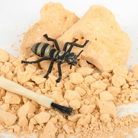Возьмите гипсовый блок и удобно расположите для работы на поверхности. Возьмите долото и начинайте процесс раскопок. Когда появится какая-то часть насекомого лишний гипс можно смахнуть кисточкой. После полного освобождения игрушки нужно по картинке на карточке сопоставить какое именно это насекомое и прочитать информацию о нем на обратной стороне карточки. Таким образом ваш ребенок будет не только увлечен процессом раскопок, но и процессом изучения информации о каждом насекомом из набора. Чтобы легче извлечь игрушку из гипсового блока, его можно поместить в воду на 15-20 минут для размягчения гипса.