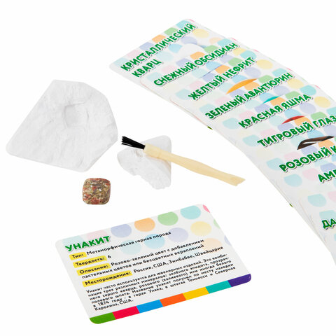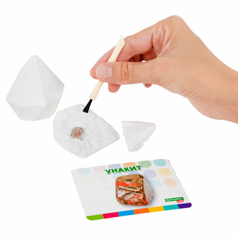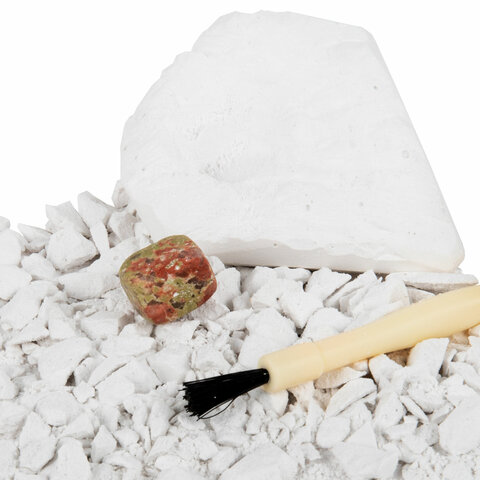 Возьмите гипсовый блок и удобно расположите для работы на поверхности. Возьмите долото и начинайте процесс раскопок. Когда появится какая-то часть минерала лишний гипс можно смахнуть кисточкой. После полного освобождения камня нужно по картинке на карточке сопоставить какой именно это камень и прочитать информацию о нем на обратной стороне карточки. Таким образом ваш ребенок будет не только увлечен процессом раскопок, но и процессом изучения информации о каждом минерале из набора. Чтобы легче извлечь камень из гипсового блока, его можно поместить в воду на 15-20 минут для размягчения гипса.