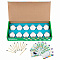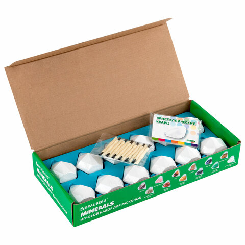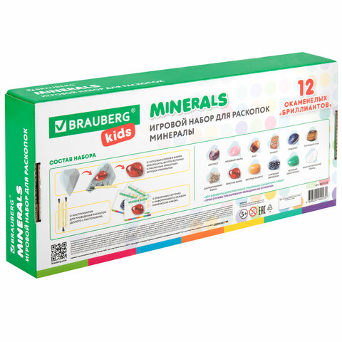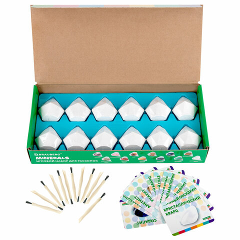 В набор входят 12 гипсовых блоков в форме бриллианта с минералами внутри, 12 инструментов для проведения раскопок (долото с кисточкой), 12 красочных двусторонних карточек с информацией о каждом минерале из набора.