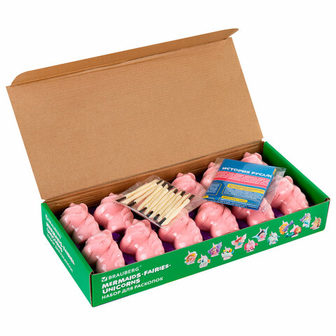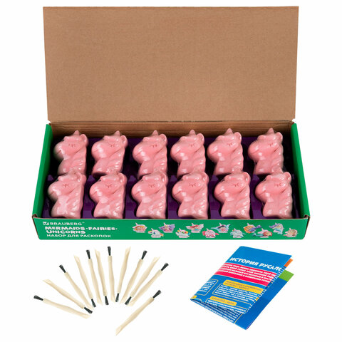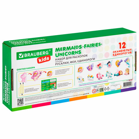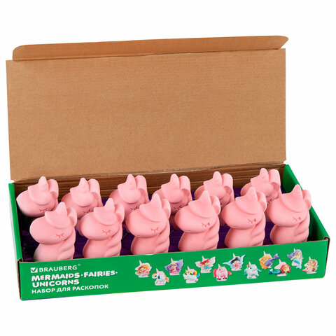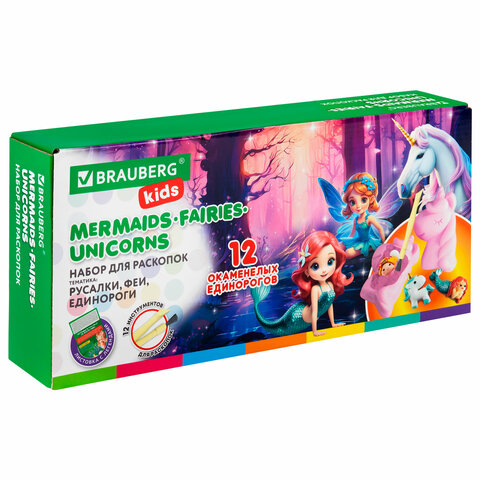 В набор входят 12 гипсовых блоков в форме единорога с разными сказочными существами внутри, 12 инструментов для проведения раскопок (долото с кисточкой), 1 красочный постер с легендами о феях, русалках и единорогах.